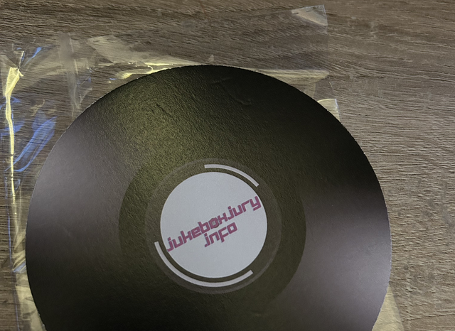 4 inch embossed pulp board coaster in the shape of a vinyl record with details of Jukebox Jury live at the Edinburgh Fringe
