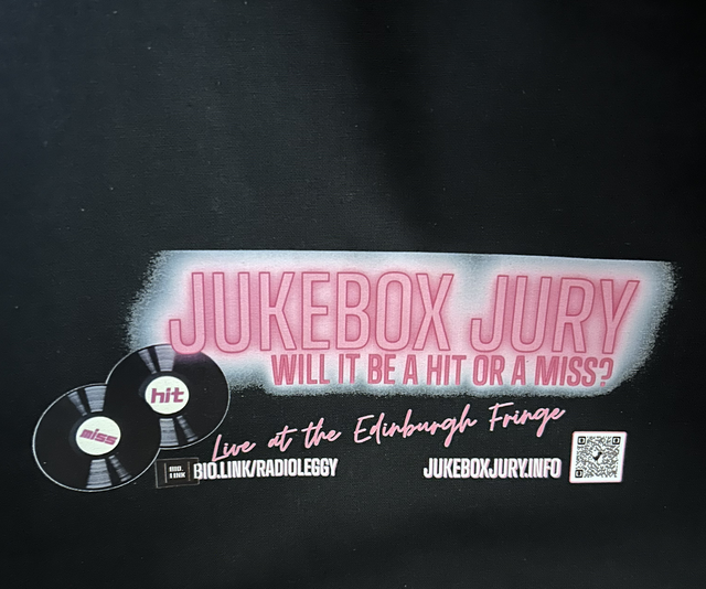 Black cotton tote bag with Jukebox Jury LIVE at The Edinburgh Fringe logo